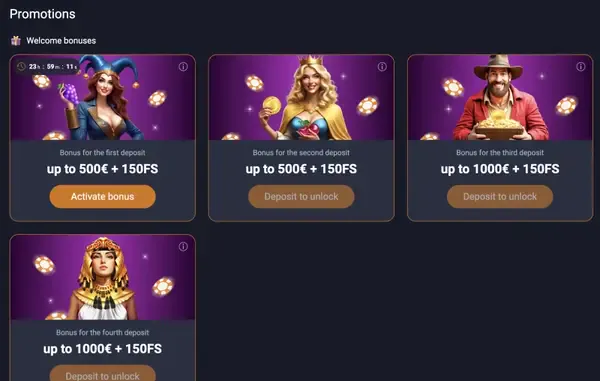 Unser Willkommenspaket ist einzahlungsbasiert und umfasst Bonusguthaben plus Freispiele. 1. Einzahlung: 100% bis zu €500 + 50 Freispiele (min €20) oder 125% bis zu €500 + 100 Freispiele (min €30). 2. Einzahlung: 125% bis zu €500 + 50 Freispiele (min €20) oder 150% bis zu €500 + 100 Freispiele (min €30). 3. Einzahlung: 150% bis zu €1.000 + 50 Freispiele (min €30). Hauptbedingungen: 30x Umsatzanforderung gilt. Berechtigte Spiele und der Gültigkeitszeitraum werden auf jeder Angebotsseite angezeigt, bevor du beanspruchst.